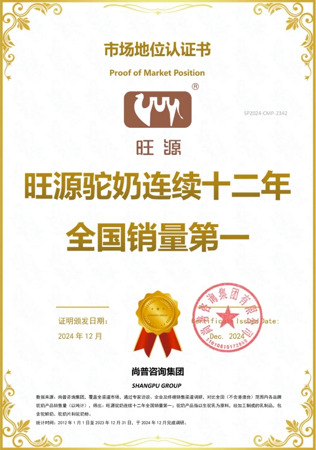 此次荣获尚普咨询集团颁发的旺源驼奶连续十二年全国销量第一的认证,是旺源驼奶发展历程中的重要里程碑。旺源驼奶将以此为契机,继续坚守品质承诺,以科学为依托,以匠心灌注产品灵魂,让健康与美味同行,为更多家庭带来健康与幸福!